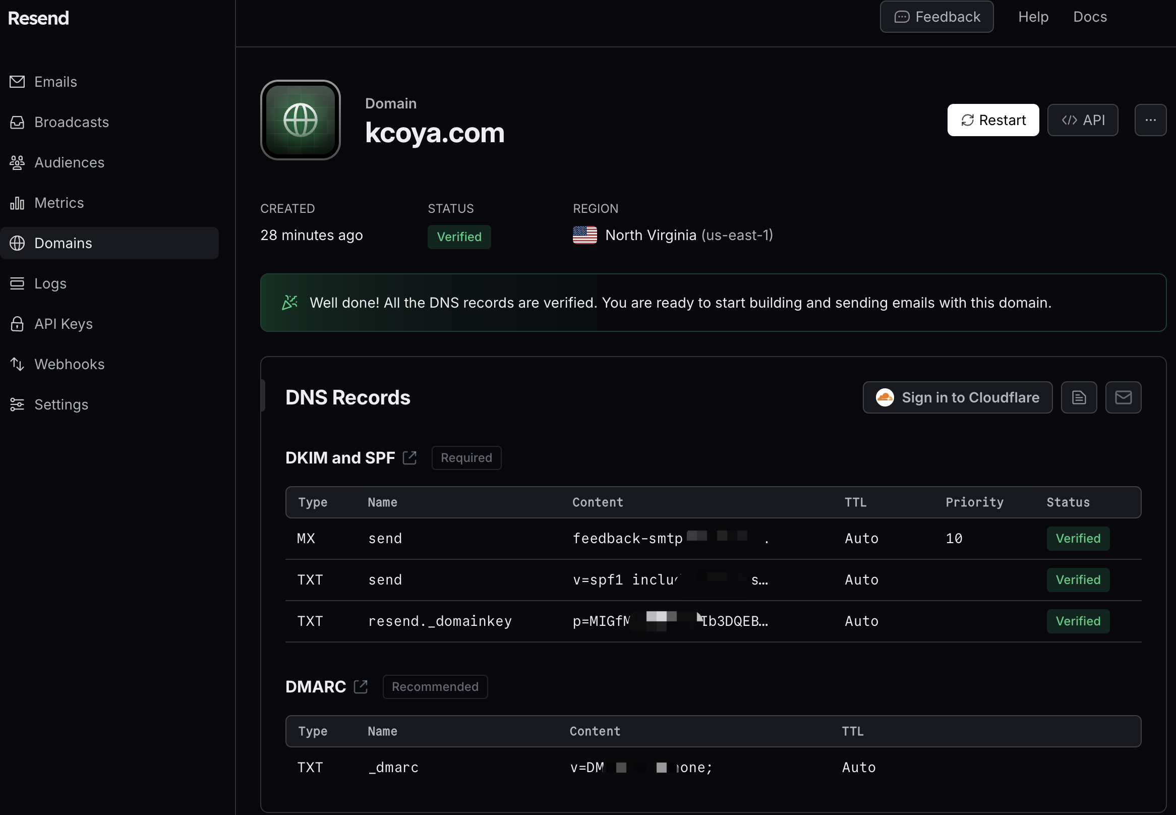 #3.5 Resend的domains设置中,将解析同步到Cloudflare中,确保验证通过。否则会出现用别名无法发送的情况。